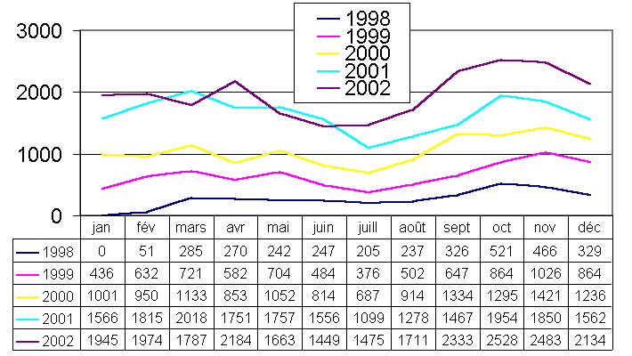 Résumé de la fréquentation : 1998 - 2002 (par mois)