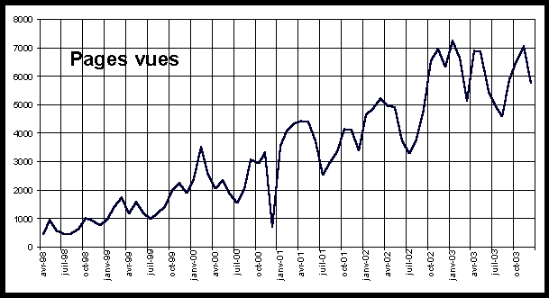 Alors qu'en 2003, le nombre de visiteurs (uniques dans la journée) diminue (- 13,6 %) , le nombre de pages vues augmentent (+21,6 %). Cette anomalie s'explique probablement par un changement du comportement des internautes dû aux connexions haut débit (ADSL) forfaitaires.