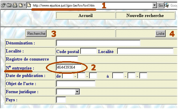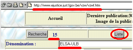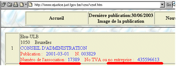 (**) La recherche aboutira plus surement avec le numéro qu'avec la désignation ... Par exemple, vous ne trouverez pas les publications postérieures au 30 juin 2003 de l'ASBL "ELSA-ULB" en remplissant le champ "dénomination". Par contre, si vous compléter le champ "N° entreprise" par "435596613", vous aurez accès aux publications de cette association.